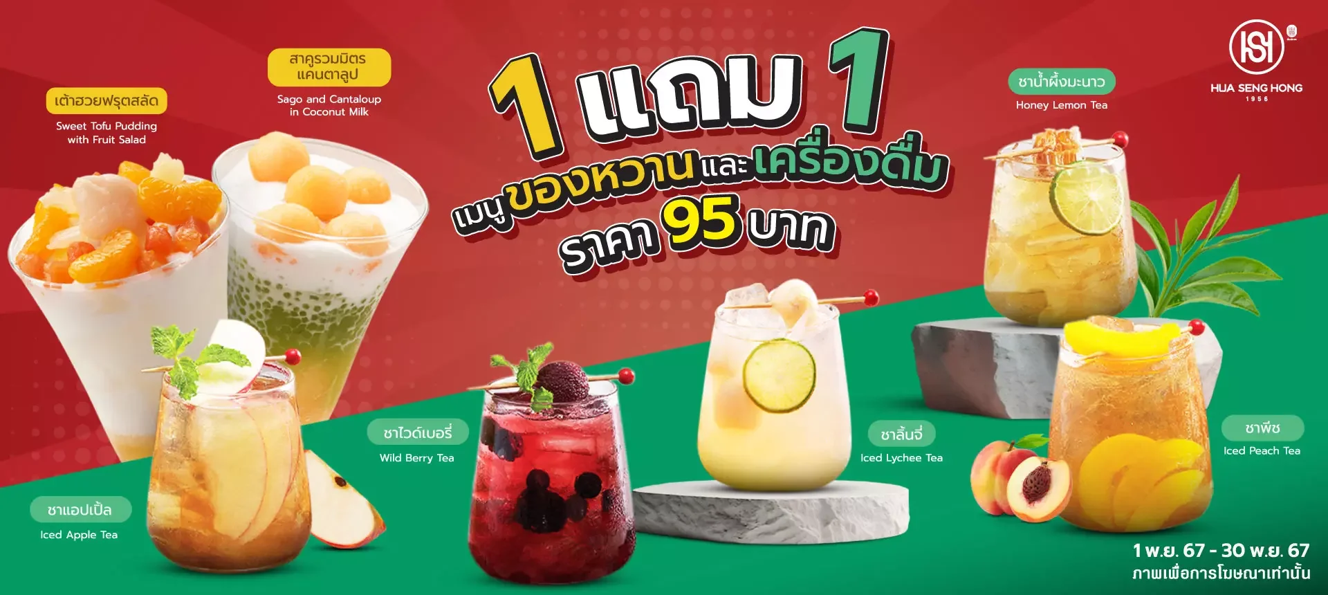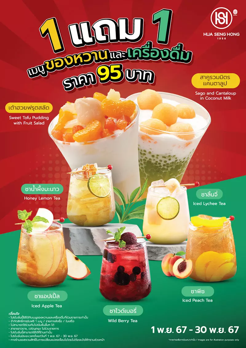 มาลิ้มลองความอร่อยและรับสิทธิ์สุดคุ้มไปกับโปรโมชั่น 1 ฟรี 1 ของหวานและเครื่องดื่ม ได้แล้ววันนี้ที่ฮั่วเซ่งฮง อย่าพลาดโอกาสดี ๆ ที่จะเติมความหวานและสดชื่นในราคาสุดพิเศษนะคะ!