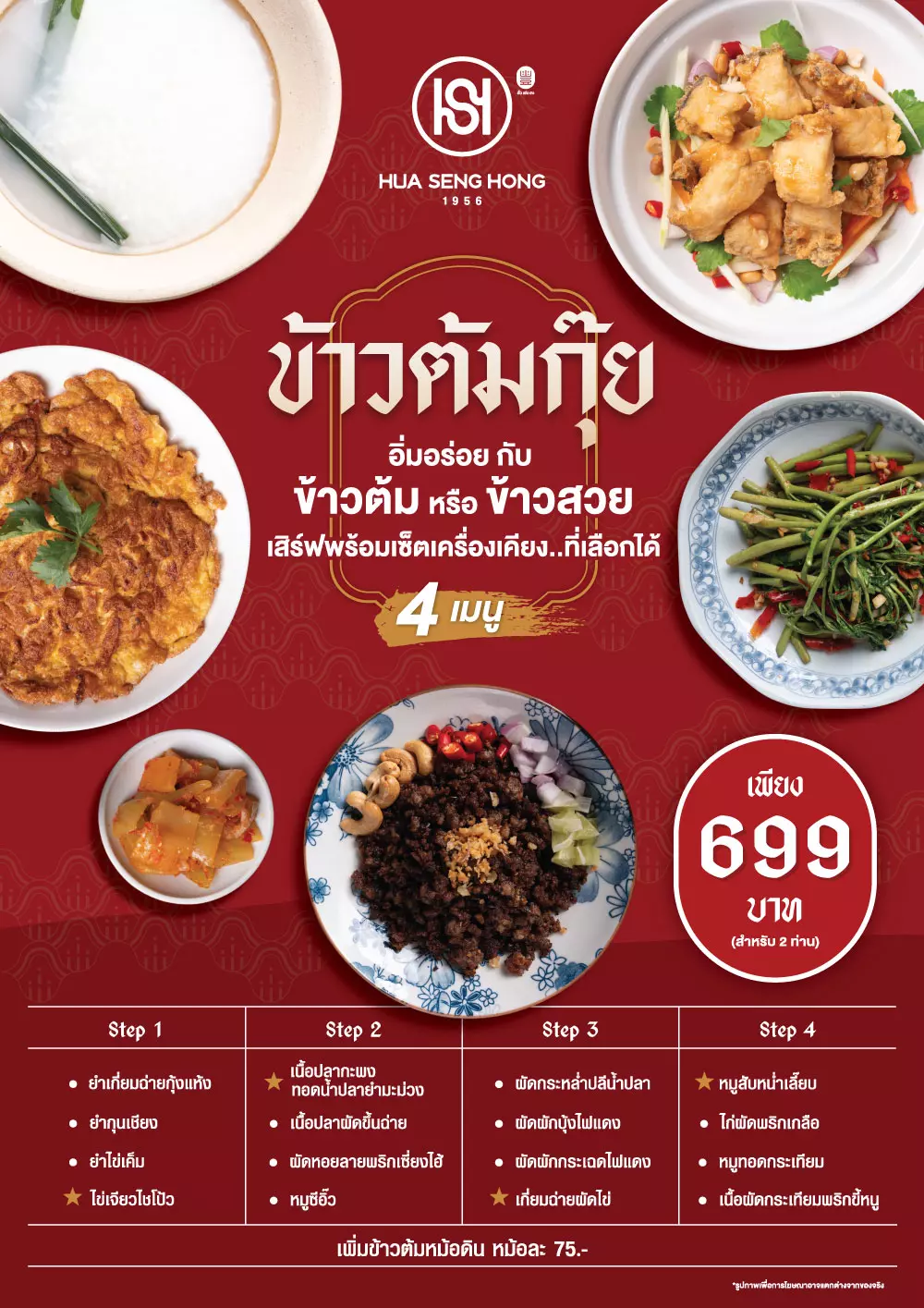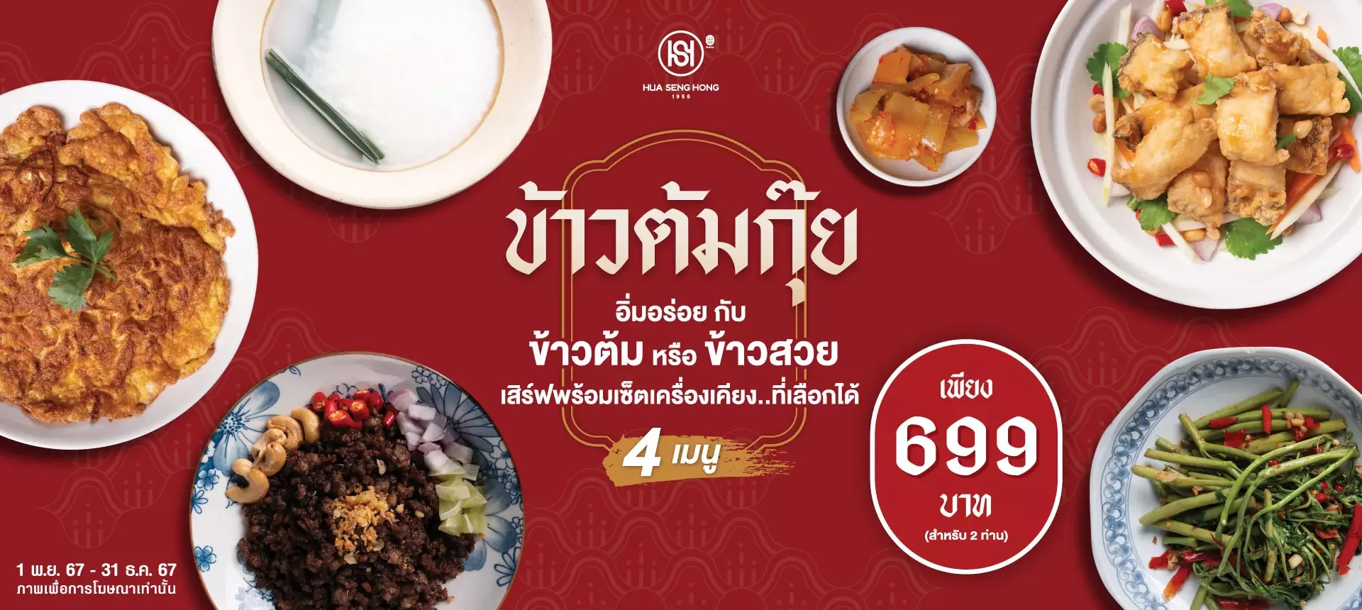 ฮั่วเซ่งฮงขอเชิญชวนคุณมาสัมผัสรสชาติแบบไทย ๆ ด้วยเมนู ข้าวต้มกุ๊ย ที่ให้คุณได้อิ่มอร่อยกับข้าวต้มร้อน ๆ หรือข้าวสวยหอมกรุ่น พร้อมกับข้าวที่คุณสามารถเลือกเองได้ถึง 4 เมนูจาก 4 หมวด ไม่ว่าจะเป็นเมนูยำรสจัดจ้าน ผัดผักหรือเนื้อสัตว์ที่ปรุงอย่างพิถีพิถัน ทั้งหมดนี้ในราคา เพียง 699 บาท เท่านั้น เหมาะสำหรับมื้ออาหารที่อยากลิ้มลองความหลากหลายอย่างเต็มอิ่ม