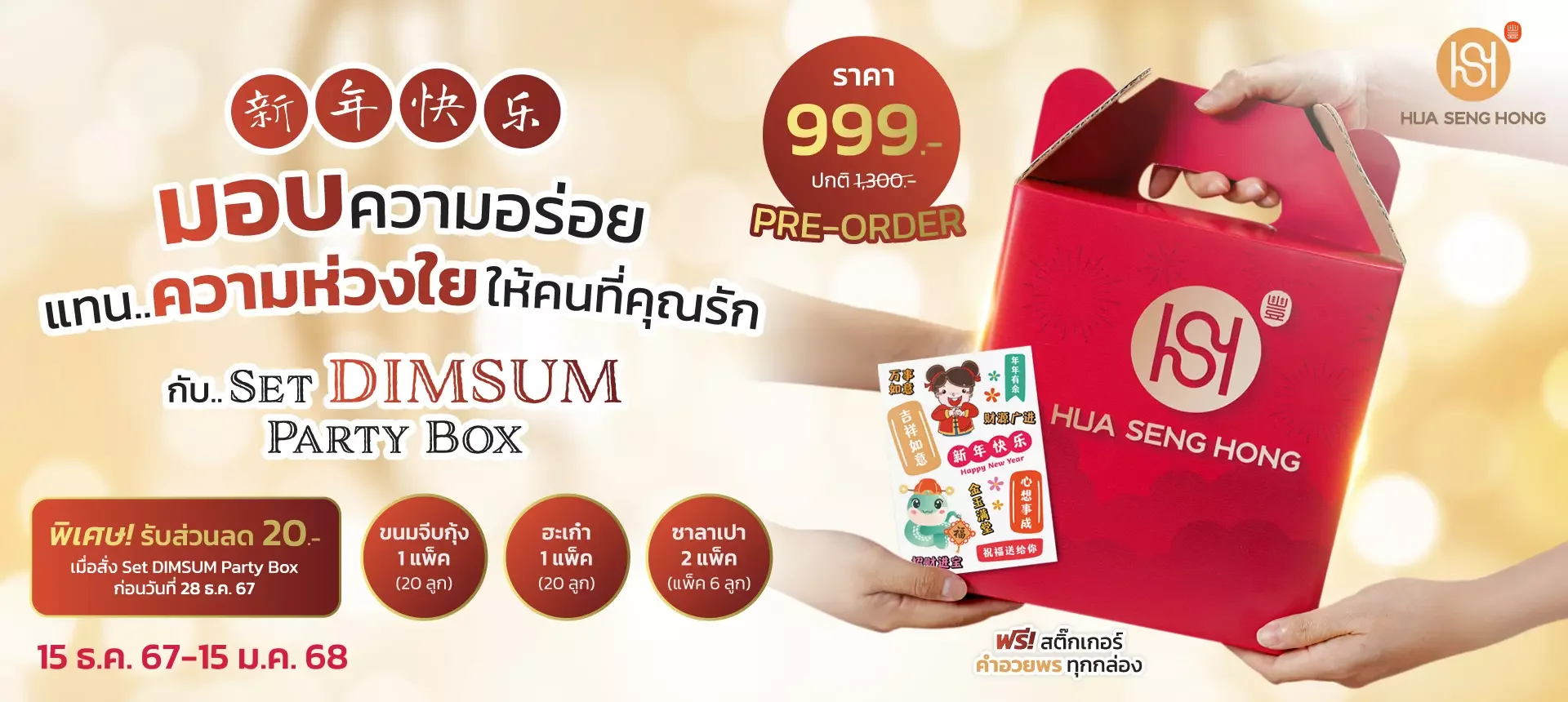 ฮั่วเซ่งฮงขอเชิญคุณมาร่วมฉลองเทศกาลแห่งความสุขกับ Set Dimsum Party Box เมนูสุดพิเศษที่รวมติ่มซำยอดนิยมไว้ในกล่องเดียว เหมาะสำหรับการเฉลิมฉลองปีใหม่กับครอบครัวและเพื่อน ๆ ซื้อไปมอบให้คนที่คุณรักและห่วงใย หรือจะซื้อไปจัดปาร์ตี้เล็กในบ้านในราคาสุดคุ้ม เพียง 999 บาท (จากราคาปกติ 1,300 บาท)