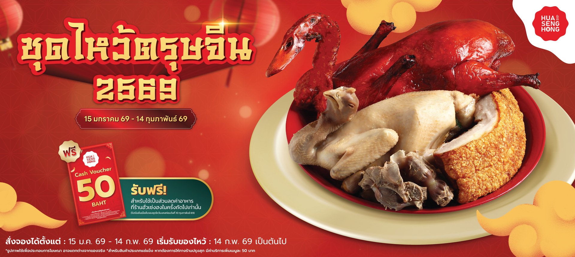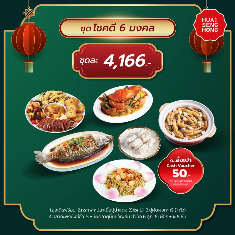 - รับฟรี!! Cash Voucher 50 หรือ 100 บาท คูปองส่วนลดค่าอาหารที่ร้านฮั่วเซ่งฮง (ตามมูลค่าชุดที่สั่ง)