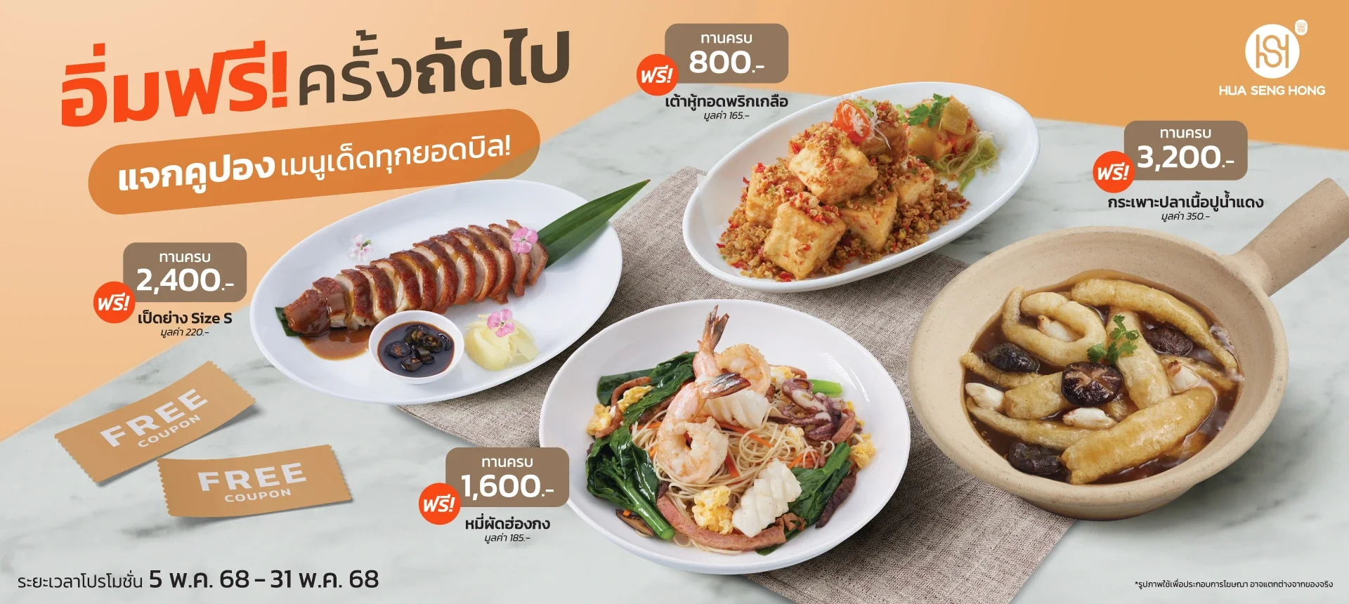 ฮั่วเซ่งฮงชวนคุณมาอร่อยและรับความคุ้มค่ากับโปรโมชั่น "อิ่มฟรีครั้งถัดไป" เพียงมารับประทานอาหารที่ร้านและมียอดบิลครบตามที่กำหนด คุณจะได้รับคูปองเมนูเด็ดฟรีทันทีเมื่อชำระเงิน นำคูปองมาใช้ในครั้งถัดไปเพื่อลิ้มรสเมนูยอดนิยมที่เราคัดสรรมาพิเศษสำหรับคุณ
