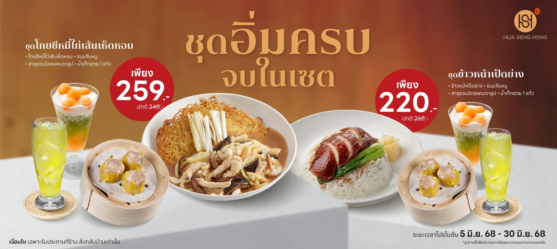 ฮั่วเซ่งฮงชวนคุณมาอิ่มอร่อยครบเครื่องกับโปรโมชั่น "ชุดอิ่มครบจบในเซต"! สัมผัสความคุ้มค่ากับชุดอาหารที่รวมเมนูหลัก ขนมจีบหมู ของหวาน และเครื่องดื่มในราคาพิเศษ ไม่ว่าจะเป็นสายเป็ดย่างหรือโกยซี่หมี่ ทุกเซตพร้อมเสิร์ฟความอร่อยให้คุณในมื้อเดียว