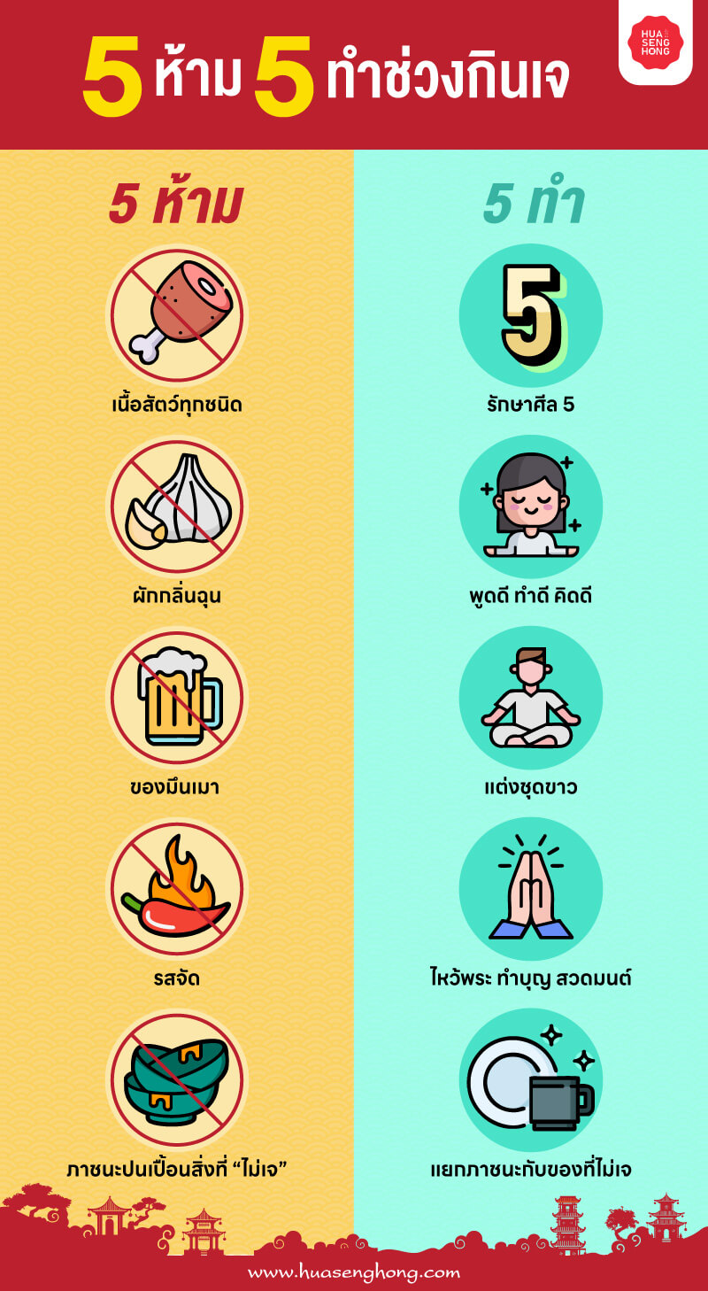 - ห้ามกิน: เนื้อสัตว์, ผักกลิ่นฉุน, ของมึนเมา, อาหารรสจัด และปนเปื้อน อาหารไม่เจ