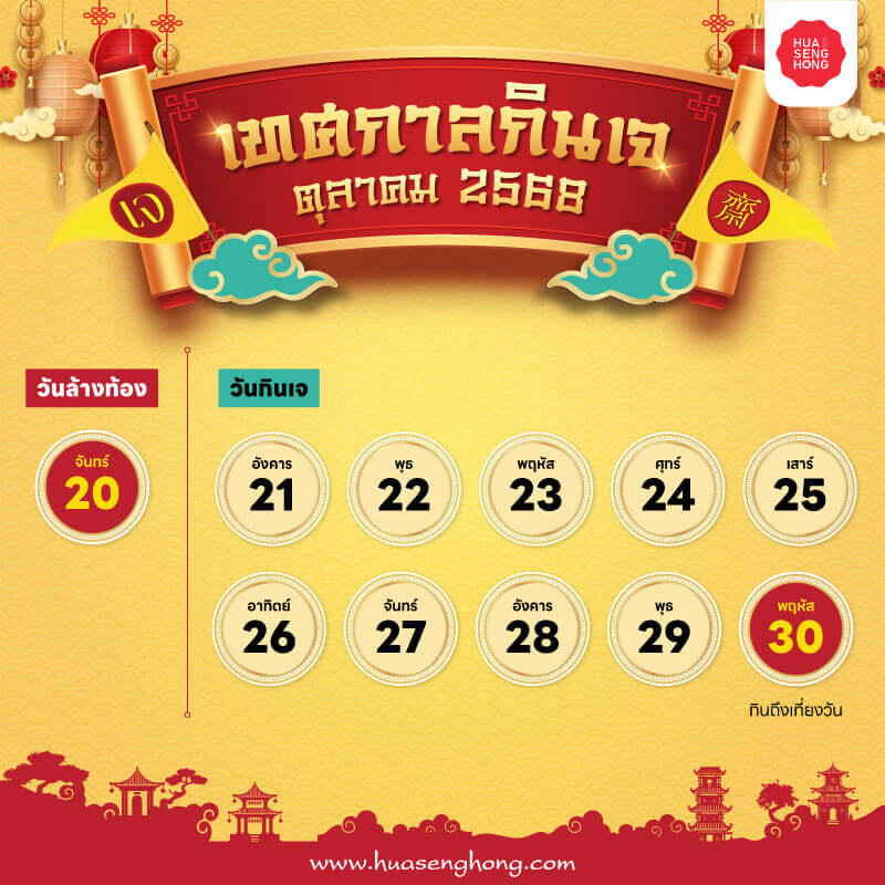- วันกินเจ 2568: 21 - 29 ตุลาคม (ล้างท้อง 20 ตุลาคม)