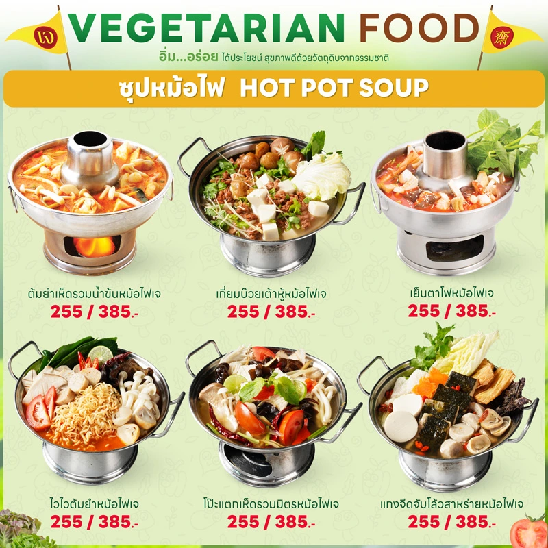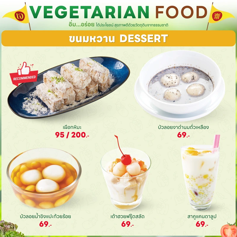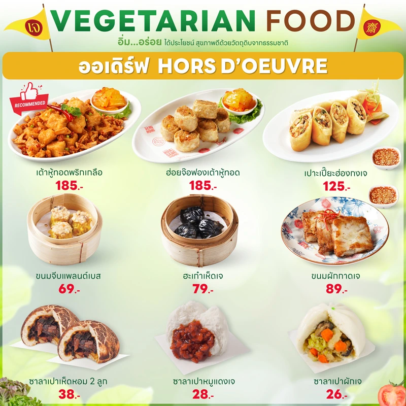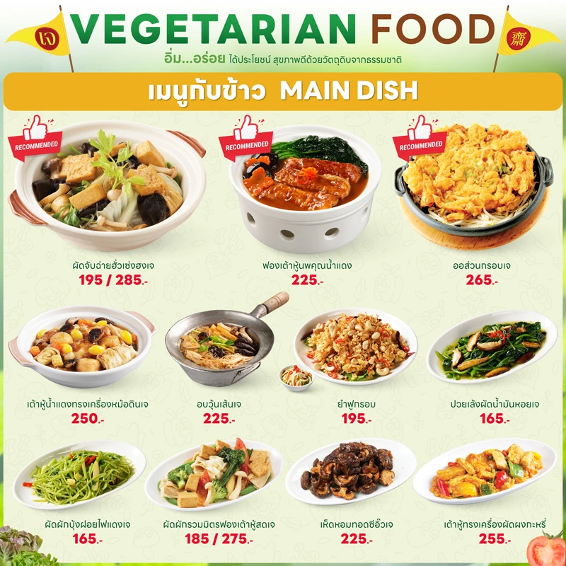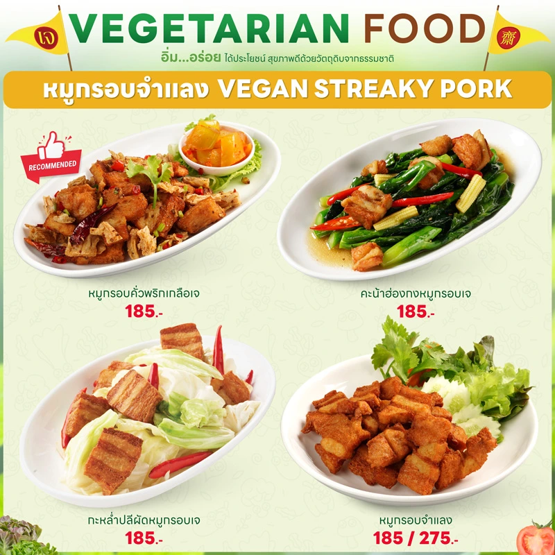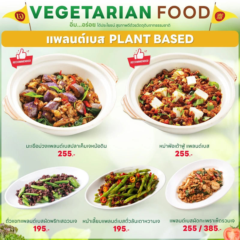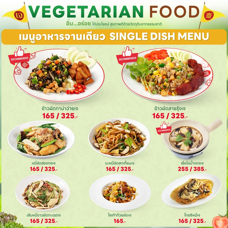 - ทุกเมนูเป็นเจ 100% ปราศจากเนื้อสัตว์ นม ไข่ และวัตถุดิบต้องห้าม