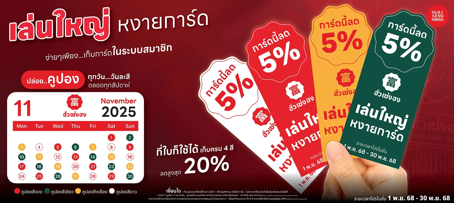 สมาชิกฮั่วเซ่งฮงทุกคน - เตรียมนิ้วให้พร้อม สะสมการ์ดออนไลน์ครบ 4 สี หงายการ์ดทีเดียว ลดสูงสุด 20% ไปเลย! จะเก็บทีละวันแล้วใช้เลย 5% หรือเก็บครบค่อยใช้ลด 20% ก็จัดได้ตามสไตล์คุณ