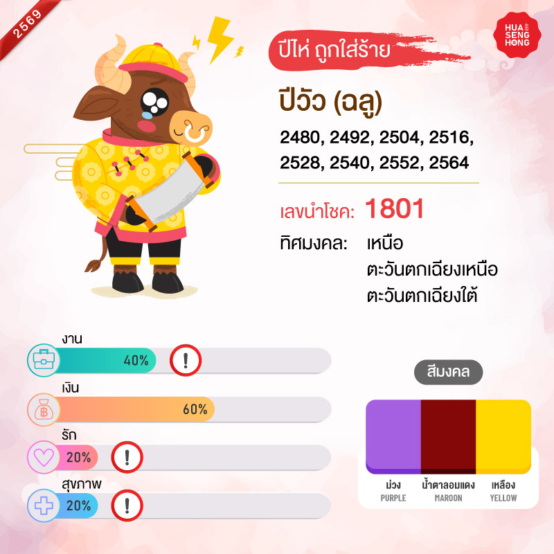 | ปีวัว (ฉลู) | ใส่ร้าย (ปีไห่) | การถูกใส่ร้าย ถูกกล่าวหา หรือถูกให้ร้าย |