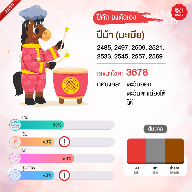 | ปีม้า (มะเมีย) | ชงตัวเอง (ปีคัก) | รุนแรงรองลงมา มักมีการเปลี่ยนแปลงในชีวิต |