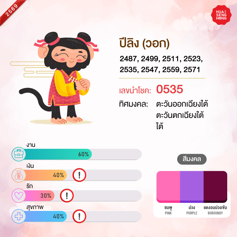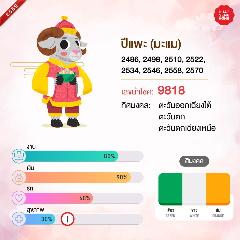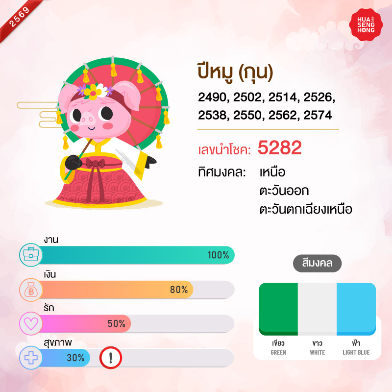 - สีมงคล: เขียว, ขาว, ฟ้า