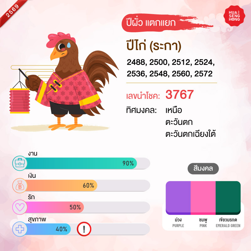 | ปีไก่ (ระกา) | แตกแยก (ปีผั่ว) | การแตกหักของหุ้นส่วน คู่รัก หรือเพื่อนฝูง |
