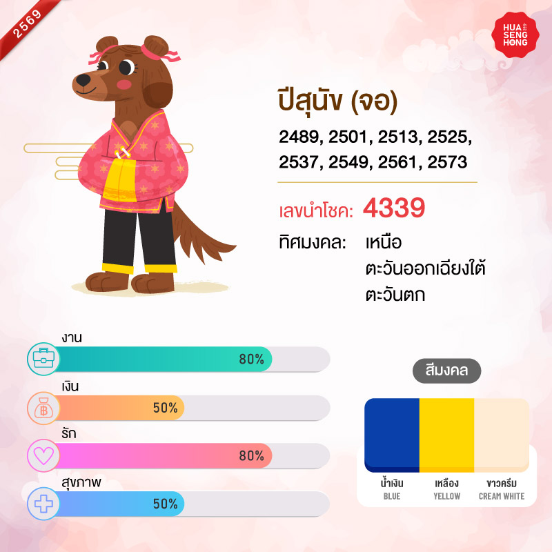 - สีมงคล: น้ำเงิน, เหลือง, ขาวครีม