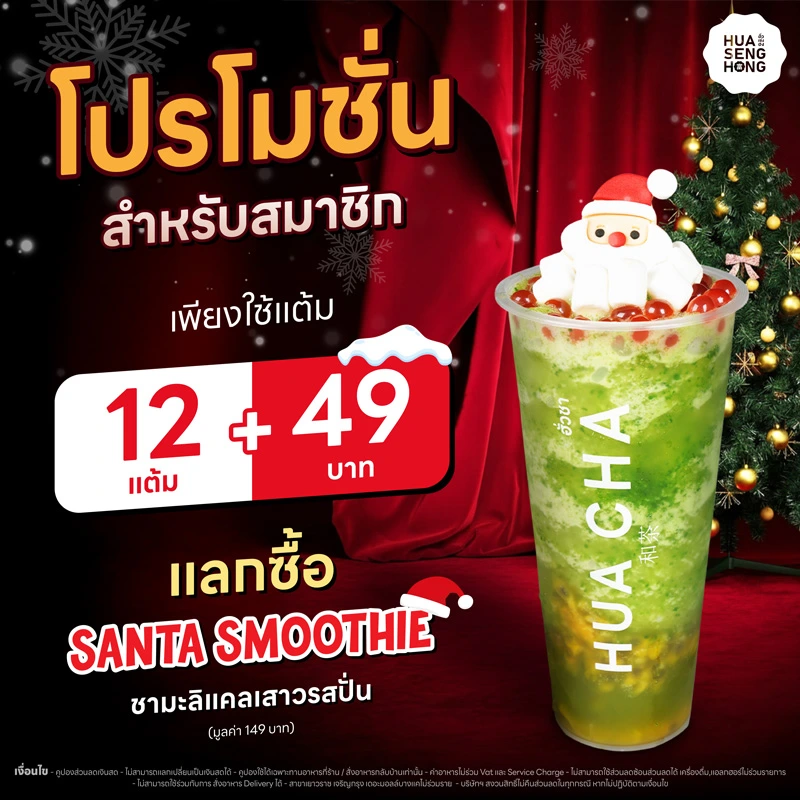 สามารถแลกรับ Santa Smoothie 1 แก้ว โดยใช้ 12 แต้ม + เงิน 49 บาท