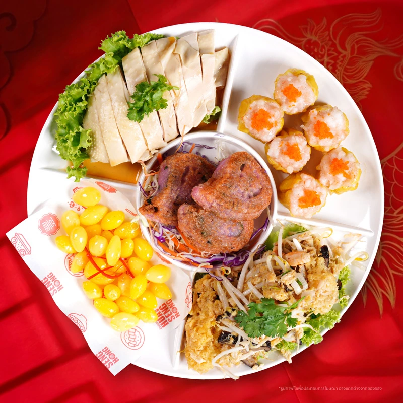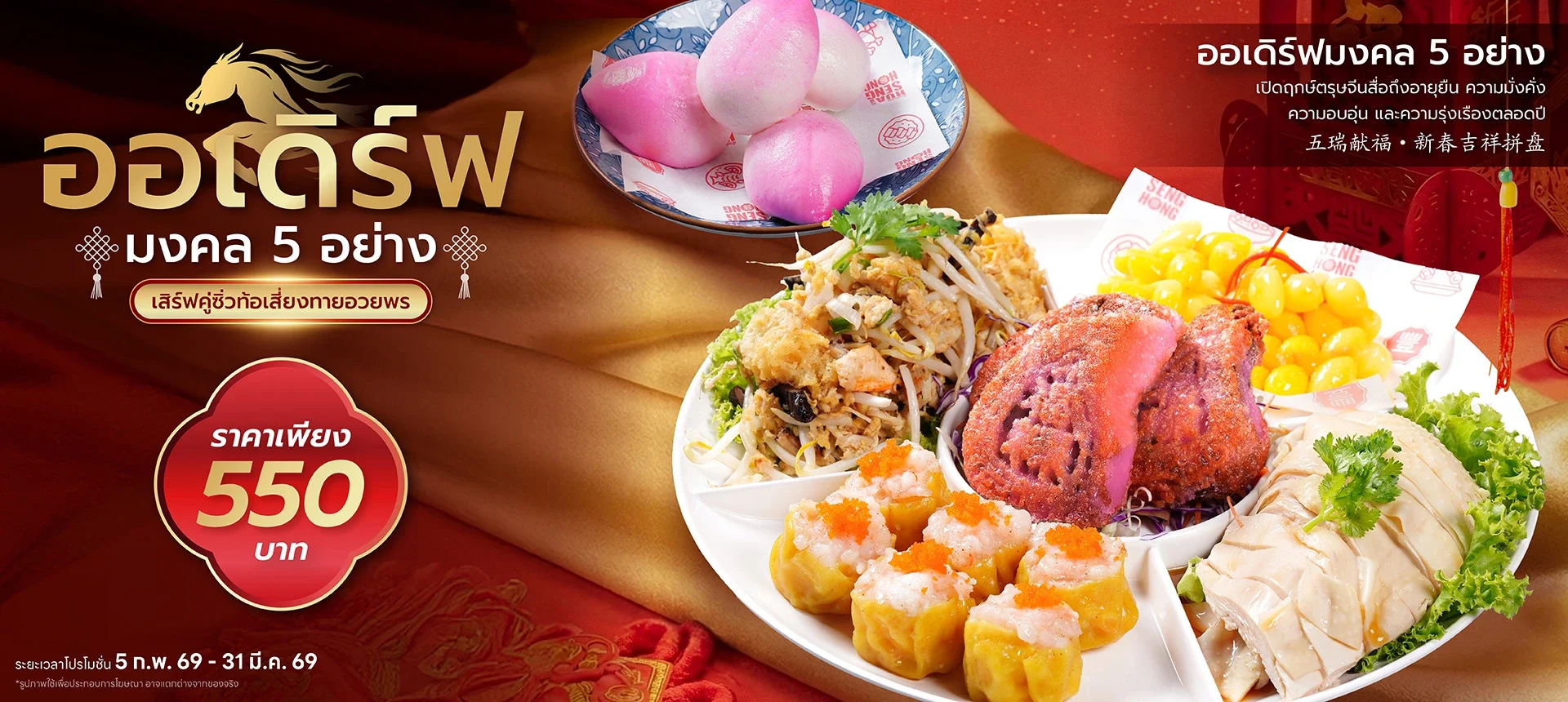 ปีนี้เราจัดให้แบบจุก ๆ กับเซ็ต ออเดิร์ฟมงคล 5 อย่าง (五瑞献福 - อู่รุ่ยเสี้ยนฝู) ที่รวม 5 สัญลักษณ์แห่งความโชคดีไว้ในจานเดียว ในราคาเพียง 550.- เท่านั้น!