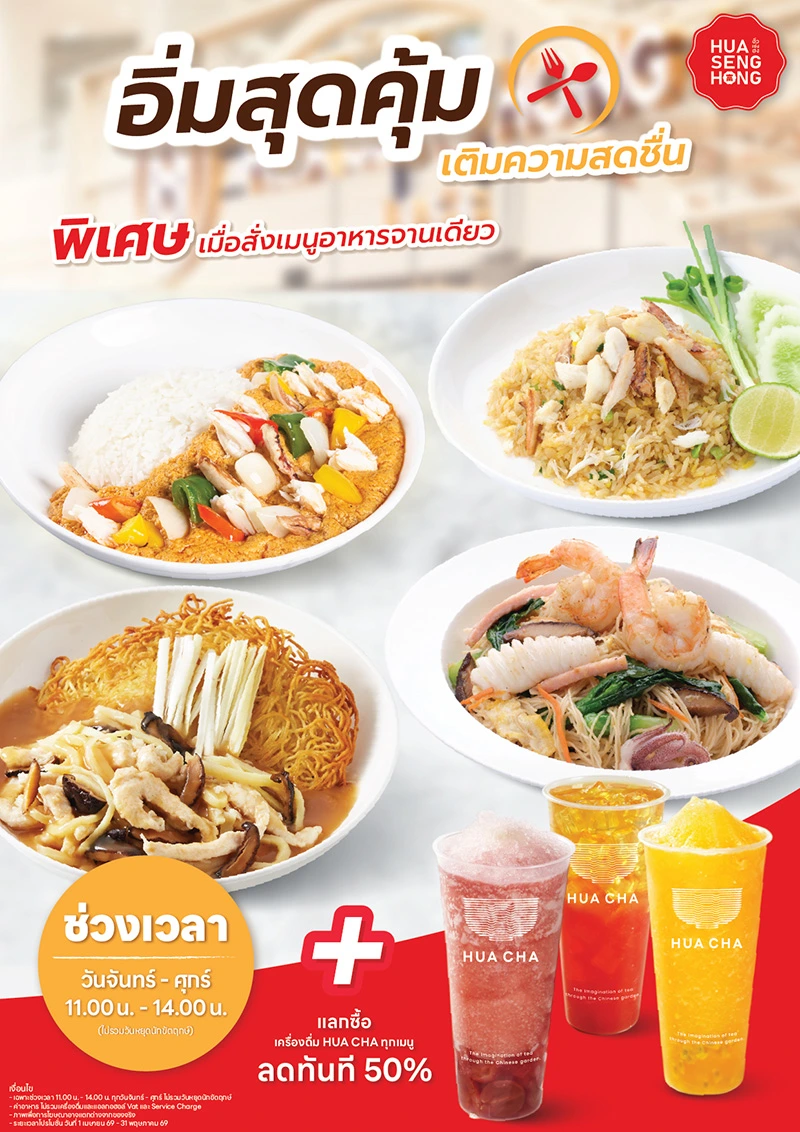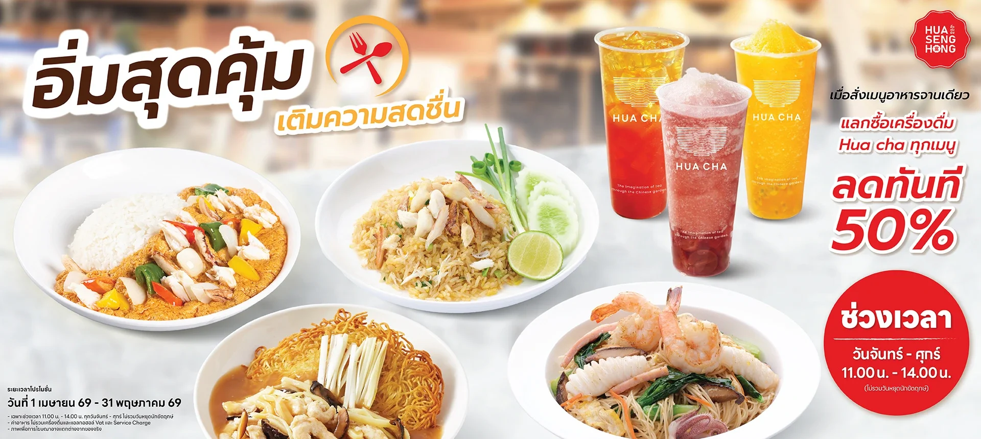 มื้อกลางวันสุดคุ้ม! สั่งอาหารจานเดียว แลกซื้อ HUA CHA ลด 50%